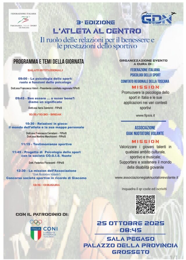 Una mattinata di formazione e confronto, organizzata dalla Federazione Italiana Psicologi dello Sport – Comitato Toscana e dall’Associazione GIAK Nuotatore Volante, con il patrocinio del CONI Toscana.